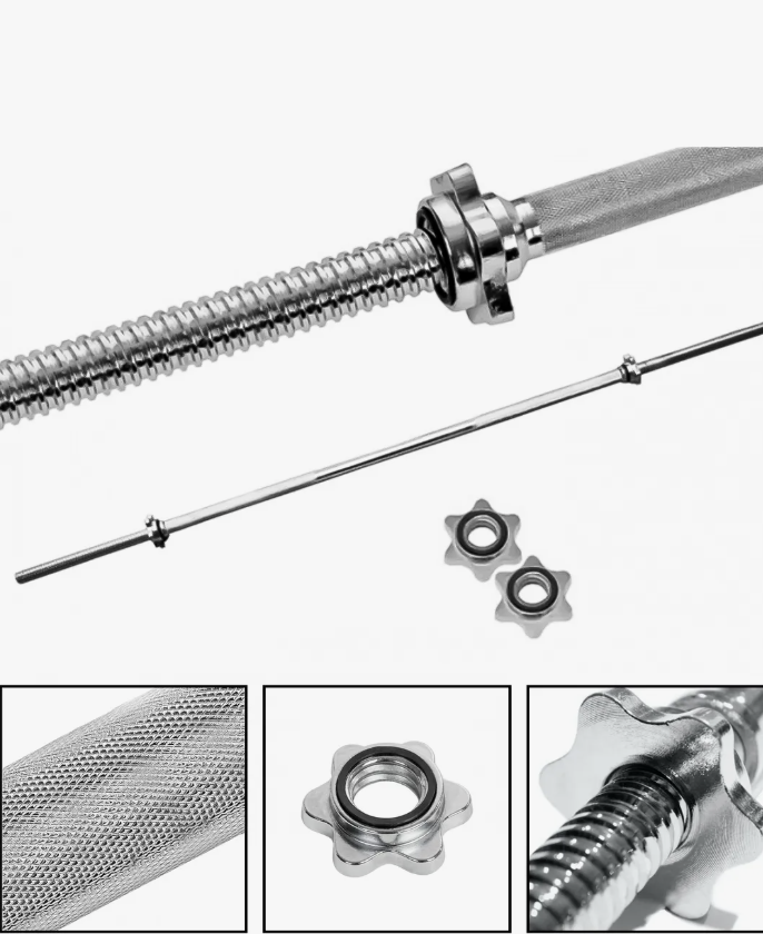 **Características:** Barra preolímpica Recta - Cromada y estriada. - Material: Acero Inoxidable - Medida: 120 cm - Diámetro: 2,5 cm - Peso: 4,5 kg - La barra tiene 2 roscas