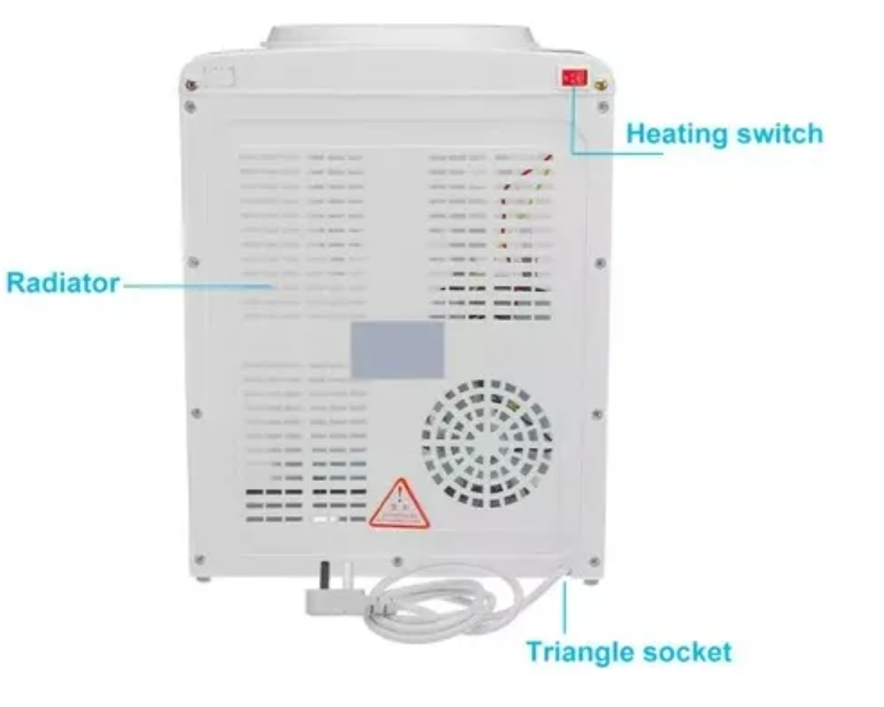 Dispensador de sobremesa con diseño elegante y sofisticado. Panel sensor de encendido calor y frío. Este producto cuenta con un sistema de enfriamiento de electro ventilador, que depende de la temperatura ambiente para su óptimo funcionamiento. (T° máxima recomendada: 30°C) Por otro lado, el calefactor funciona similar a un hervidor y alcanza temperaturas entre 85° y 90°C. Interruptores en la parte posterior para el encendido o apagado del agua fría y caliente por separado.