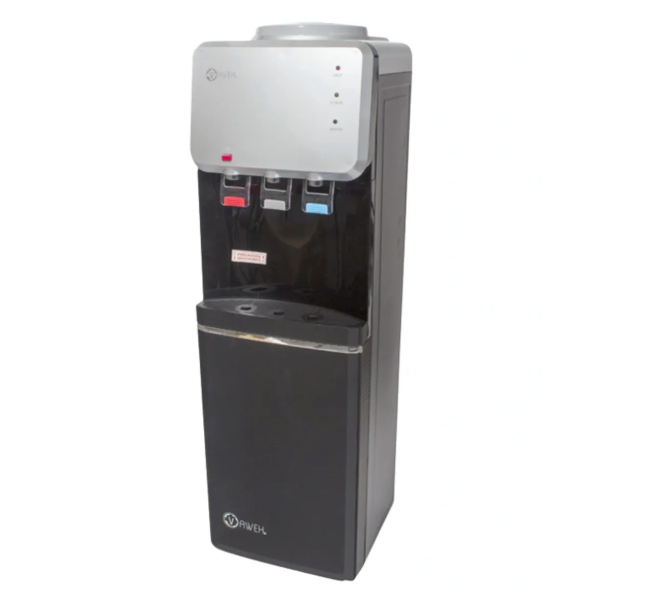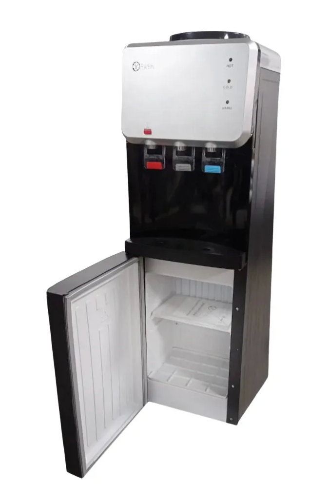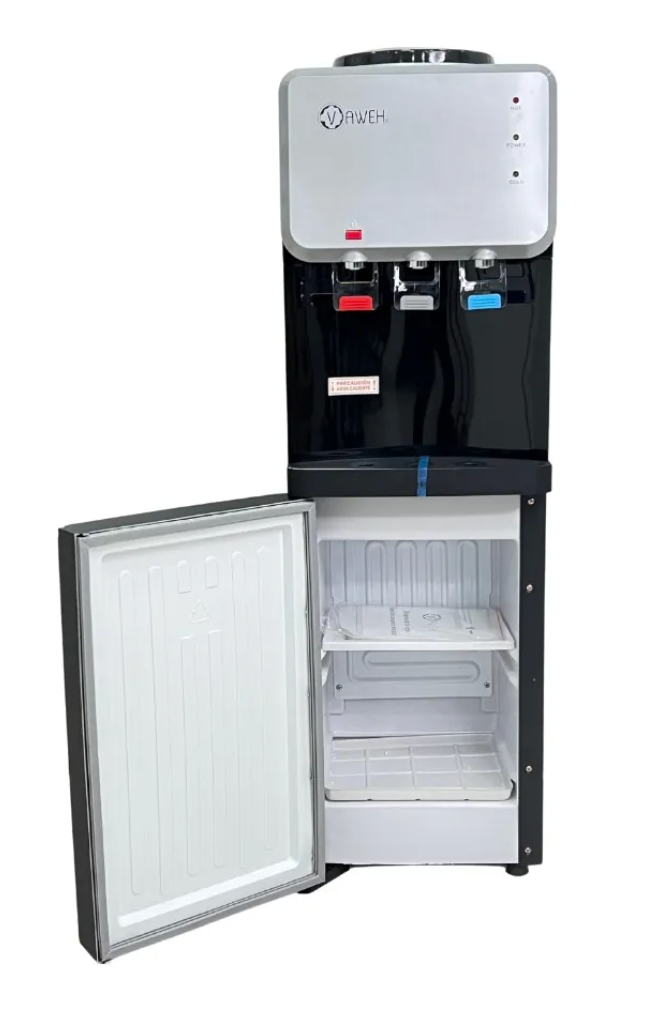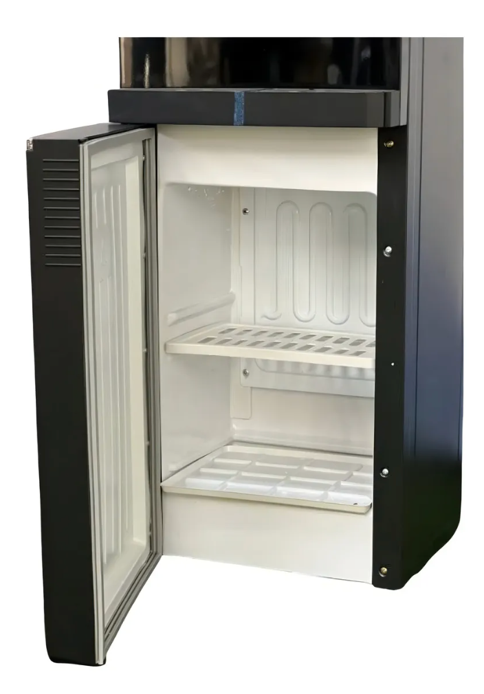 Dispensador de pedestal de gama alta con frigobar incluido. Este equipo, contiene un sistema de refrigeración que permite almacenar alimentos u otros que necesiten mantención en frío. Nuestros dispensadores de gama alta cuentan con un sistema de enfriamiento con compresor, similar al que utilizan los refrigeradores, permitiéndonos así un mejor rendimiento en el momento de enfriar el agua. (T° máxima recomendada: 38°C) El calefactor tiene un funcionamiento similar al de un hervidor, pero mantiene la temperatura entre 85° y 90° C.