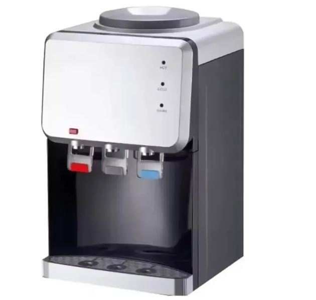 Agua Fría, Caliente y Temperatura Normal (3 llaves). Sistema de enfriado por Compresor. Color Negro. Con Seguro para Niños. Interruptores de encendido y apagado en parte posterior. Capacidad de calentamiento 90-95 °C Capacidad de enfriamiento 5-10 °C Capacidad receptáculo agua fría: 2500 cc Capacidad receptáculo agua caliente: 1500 cc Medidas: 47cm x 31 x 26 cm Peso 10 kg Para bidones de 10, 12 y 20 litros. Consumo de Energía 550W Bidón en la parte superior