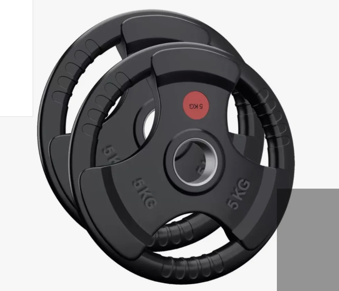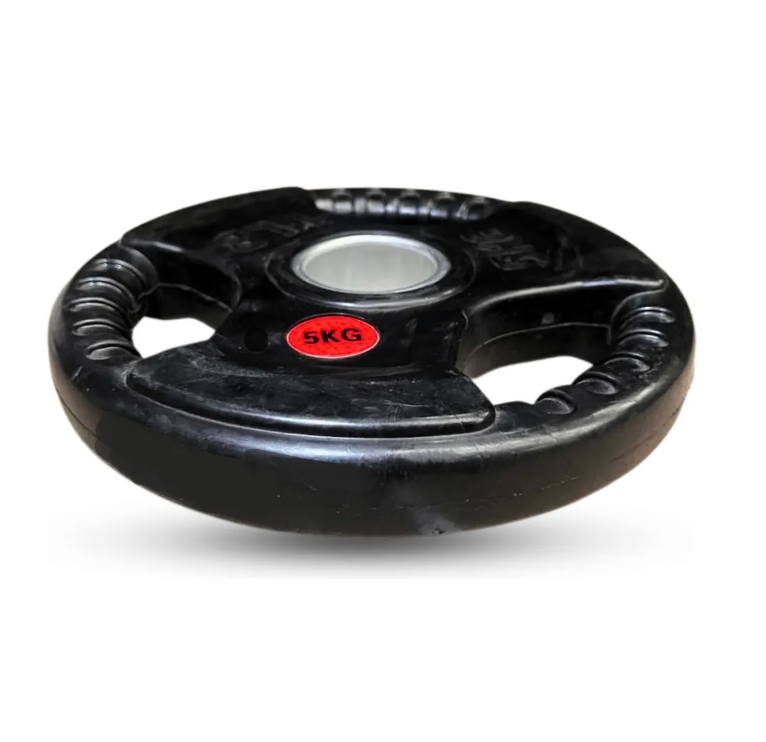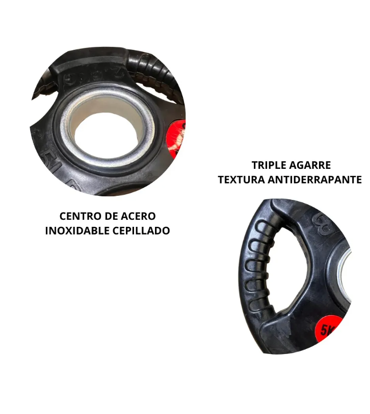 Par Disco olímpico de 5 kg. diseñado y compatible con barras olímpicas.